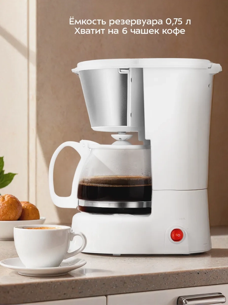 Капельная кофеварка Kitfort КТ-7631 готовит ароматный черный кофе из молотого кофе. \nПри приготовлении кофе вода нагревается, а затем подается в фильтр с молотым кофе. Многоразовым фильтром можно пользоваться неограниченное количество раз. Пройдя через фильтр, кофе поступает в стеклянный кофейник. В месте установки кофейника находится платформа для подогрева. По завершении приготовления кофе платформа продолжит нагреваться, пока не будет выключена вручную.\nРезервуар для воды емкостью 0,75 л позволяет за один раз приготовить кофе на 6 чашек (по 120 мл). В резервуаре для воды и на кофейнике есть соответствующие отметки, поэтому вам будет удобно приготовить нужное количество чашек кофе. Кофейник стеклянный, поэтому вы всегда можете видеть, сколько кофе осталось. \nВоронка кофеварки оборудована противокапельной системой — затвором, приостанавливающим подачу кофе при вынимании кофейника из кофеварки. Вы можете налить кофе в чашку, не дожидаясь окончания приготовления. \nУправление кофеваркой осуществляется при помощи одного переключателя. Устройство предназначено для приготовления кофе в домашних условиях или в офисе. \nНапряжение: ~220–240 В, 50/60 Гц. \nМощность: 550–650 Вт. \nКласс защиты от поражения электрическим током: I. \nЕмкость резервуара для воды: 0,75 л. \nЕмкость кофейника: 0,75 л. \nЕмкость фильтра: 35–40 г. \nМатериал сетки фильтра: нейлон. \nДлина шнура: 0,6 м. \nРазмер устройства: 164 × 205 × 262 мм.