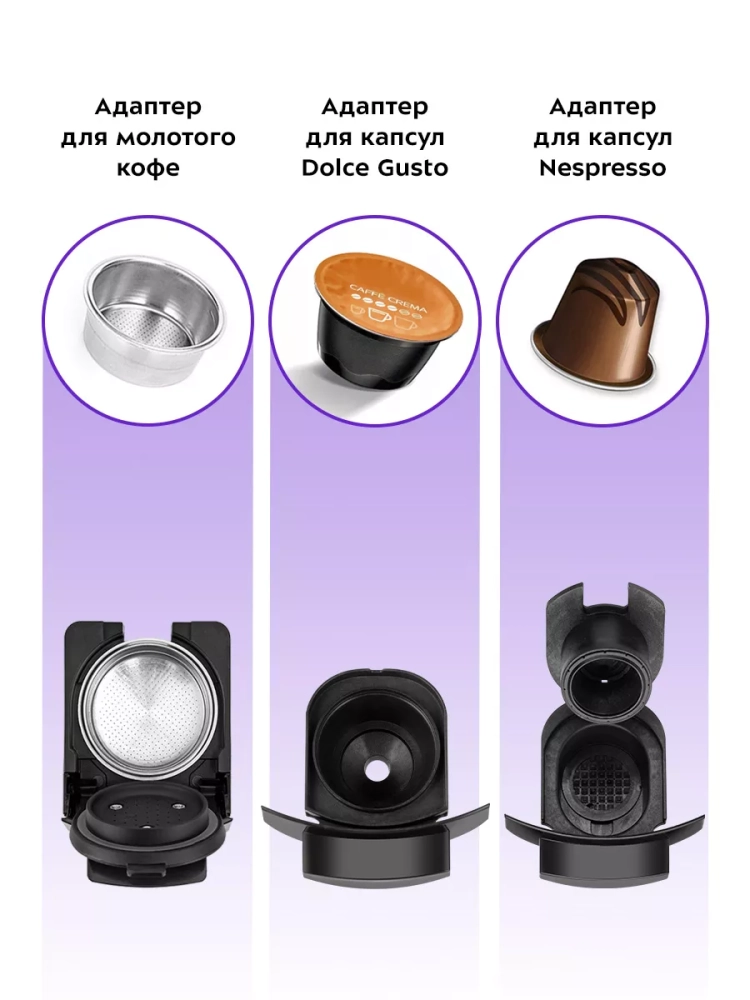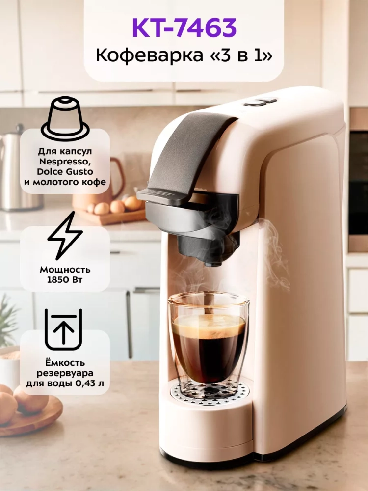 Кофеварка «3 в 1» Kitfort КТ-7463 — многофункциональное устройство, сочетающее в себе функции капсульной и рожковой кофеварок. Благодаря адаптерам кофеварка подходит для капсул типа Nespresso Original и Dolce Gusto, а также для молотого кофе.