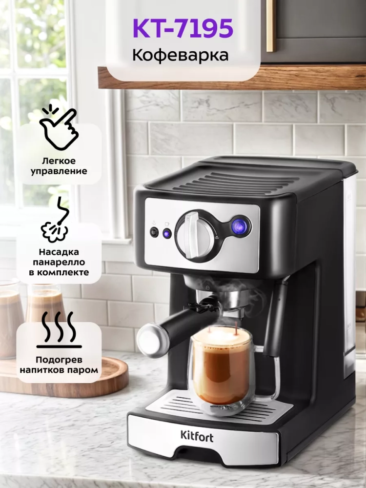 Рожковая кофеварка Kitfort КТ-7195 поможет приготовить кофе эспрессо, капучино или латте, а также множество других видов кофе на ваш вкус. С помощью стимера в рожковой кофеварке вы можете приготовить молочную пенку или подогреть паром остывшие напитки.