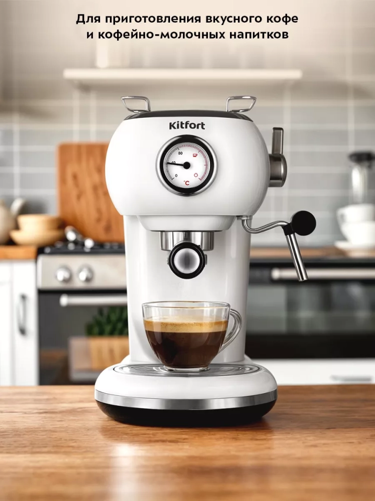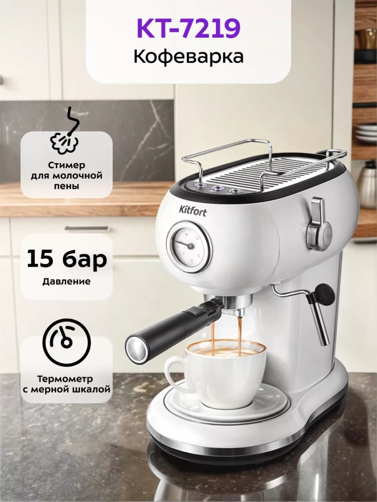 Кофеварка Kitfort КТ-7219 поможет приготовить кофе эспрессо, капучино или латте, а также множество других видов кофе на ваш вкус. С помощью стимера вы можете приготовить молочную пенку, а также подогреть паром остывший чай или молоко.