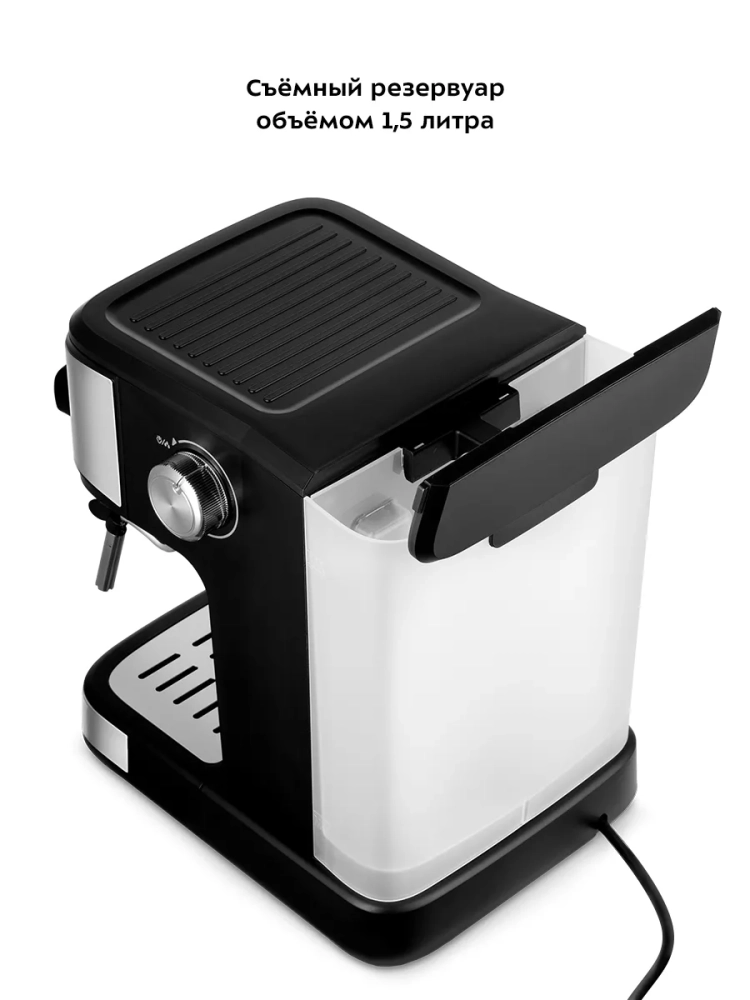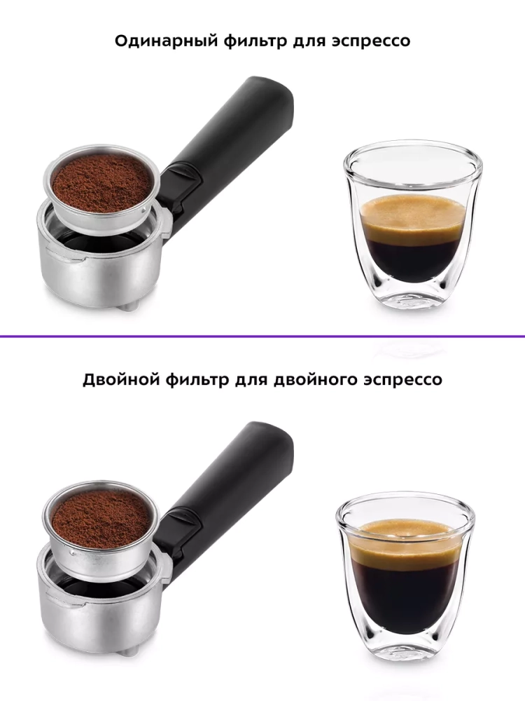 Металлический фильтр с лазерным нанесением отверстий долговечен и не требует использования каких-либо расходующихся частей. Кофеварка оснащена съемным резервуаром для воды и металлическим рожком. Металлический рожок хорошо прогревает напиток, а сам напиток получается насыщенным, густым и с хорошей пенкой.