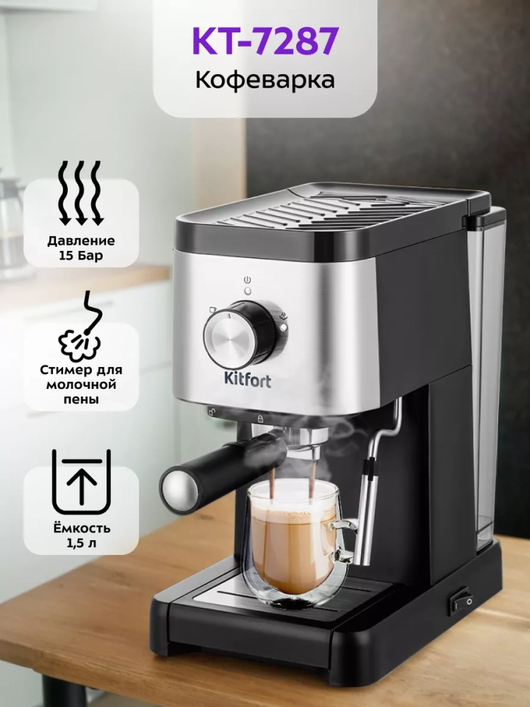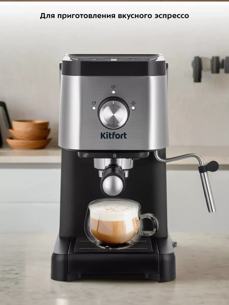 Кофеварка Kitfort КТ-7287 поможет приготовить кофе эспрессо, капучино или латте, а также множество других видов кофе на ваш вкус. С помощью стимера вы можете приготовить молочную пенку, а также подогреть паром остывший чай или молоко.