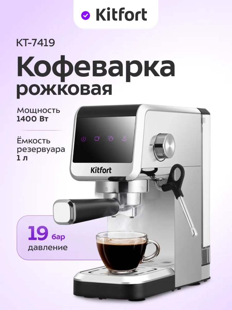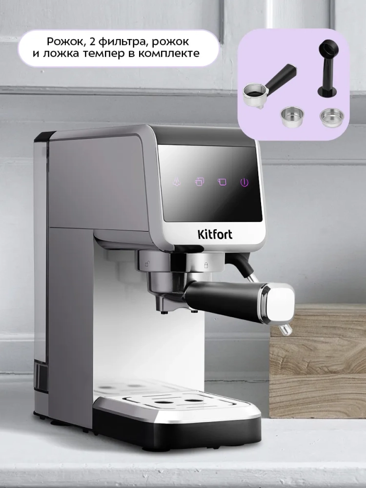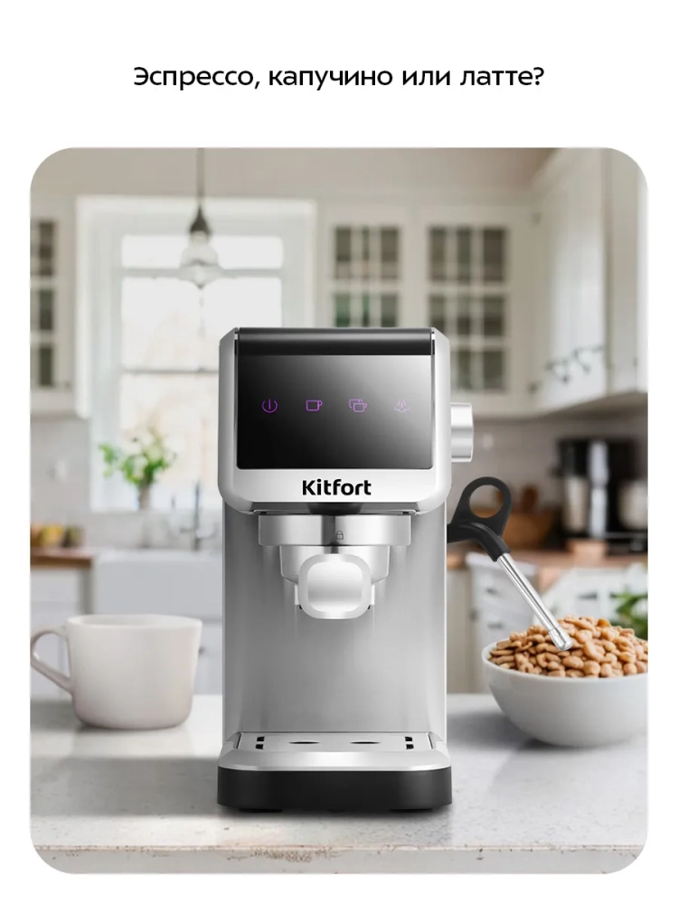 Кофеварка Kitfort КТ-7419 поможет приготовить кофе эспрессо, капучино или латте, а также множество других видов кофе на ваш вкус. С помощью стимера вы можете приготовить молочную пенку, а также подогреть паром остывший чай или молоко.