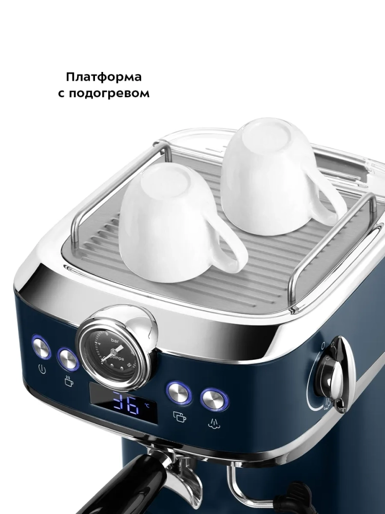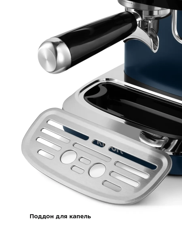 Кофеварка оснащена съемным резервуаром для воды и металлическим рожком. Металлический рожок хорошо прогревает напиток, а сам напиток получается насыщенным, густым и с хорошей пенкой. Мерная ложка-темпер поможет наполнить рожок и утрамбовать в нем кофейную таблетку.