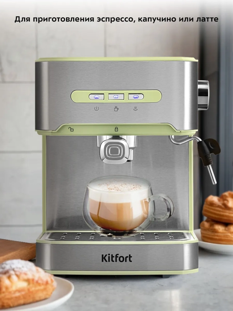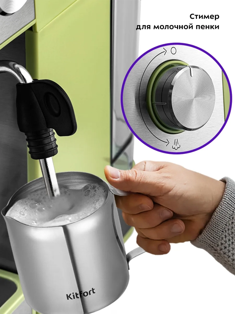 Кофеварка Kitfort КТ-7442 поможет приготовить кофе эспрессо, капучино или латте, а также другие виды кофе на ваш вкус. С помощью стимера вы можете приготовить молочную пенку, а также подогреть паром остывший чай или молоко.