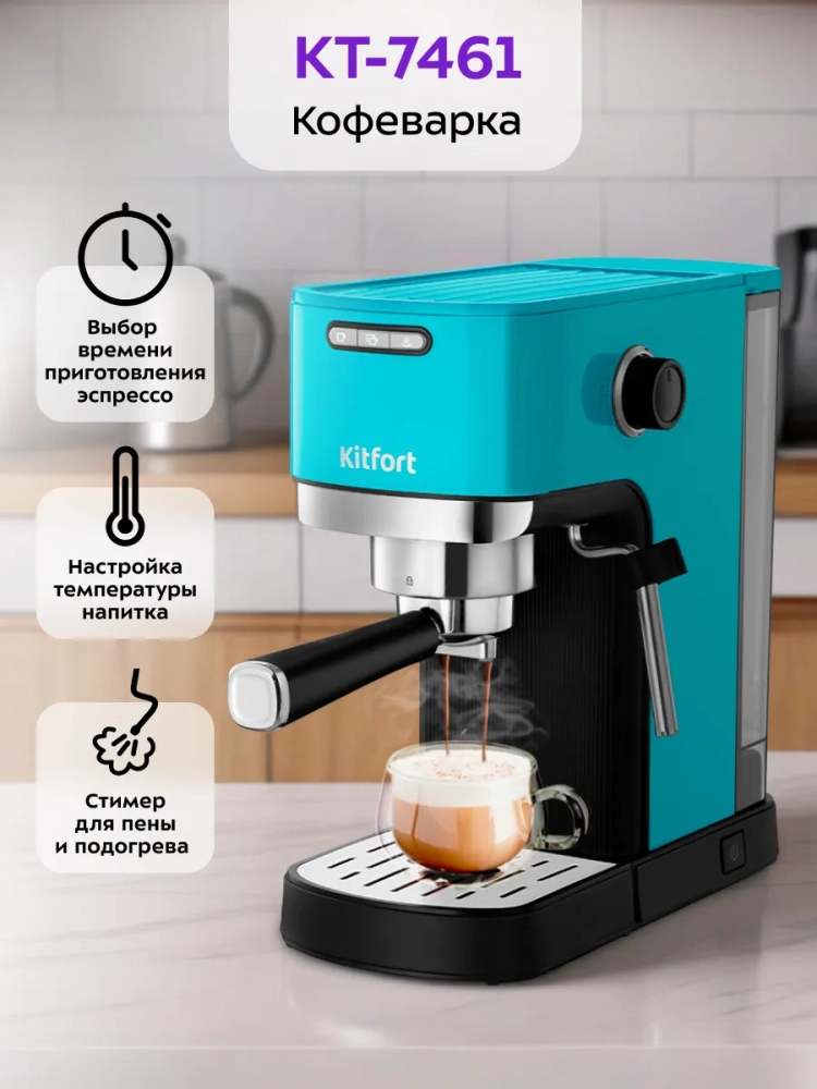 Кофеварка Kitfort КТ-7461 поможет приготовить кофе эспрессо, капучино или латте, а также множество других видов кофе на ваш вкус. С помощью стимера вы можете приготовить молочную пенку, а также подогреть паром остывший напиток.