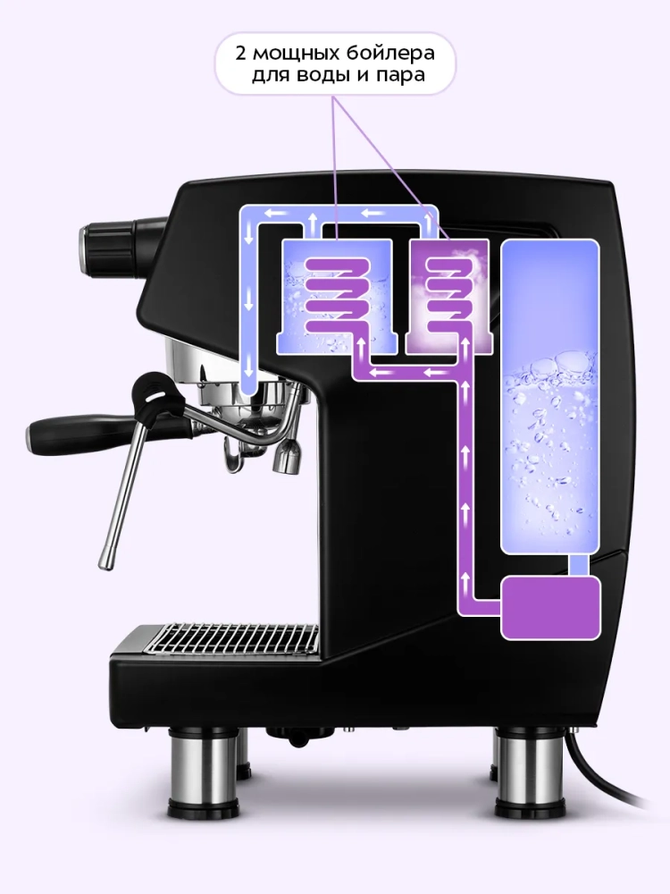 Тонко-настроенная система подачи давления воды в рожок КТ-7531 помогает усилить экстракцию кофе, что позитивно влияет на вкус. Для более точного ощущения дескрипторов кофе, советуем ориентироваться на формулу: 18 г молотого зерна на 36 мл напитка.