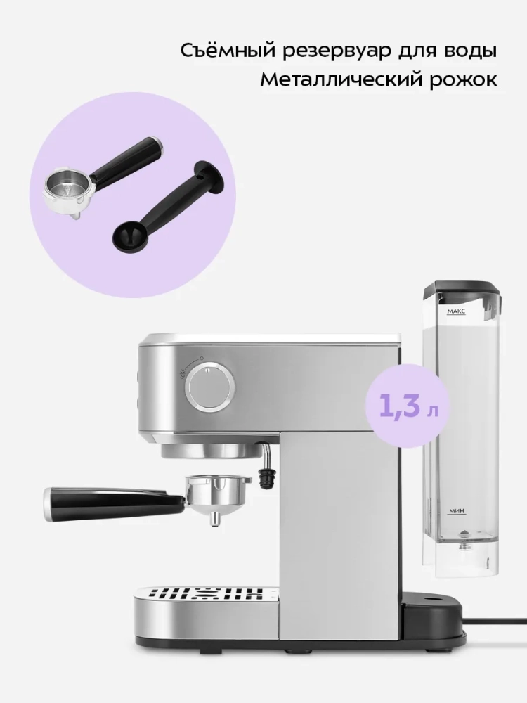 Металлические фильтры с лазерным нанесением отверстий долговечны и не требуют использования каких-либо расходующихся частей. Кофеварка оснащена съемным резервуаром для воды и металлическим рожком. Металлический рожок хорошо прогревает напиток, а сам напиток получается насыщенным, густым и с хорошей пенкой. Мерная ложка-темпер поможет наполнить рожок и утрамбовать в нем кофейную таблетку.