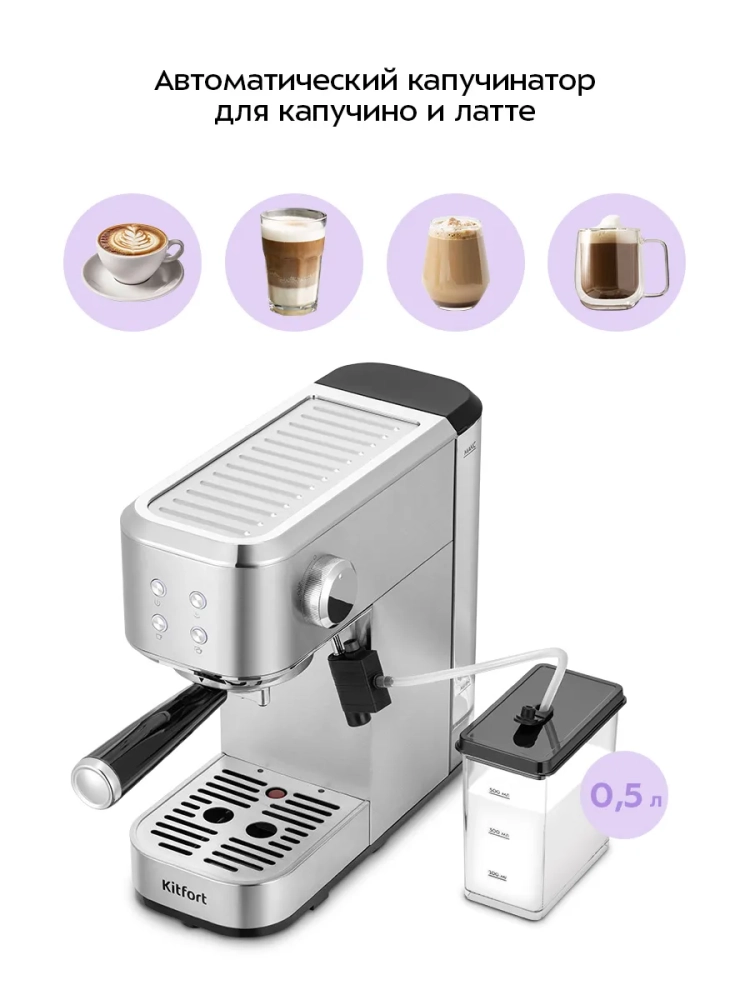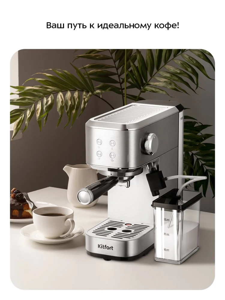 Рожковая кофеварка Kitfort КТ-7641 поможет приготовить кофе эспрессо, капучино или латте, а также множество других видов кофе на ваш вкус.
