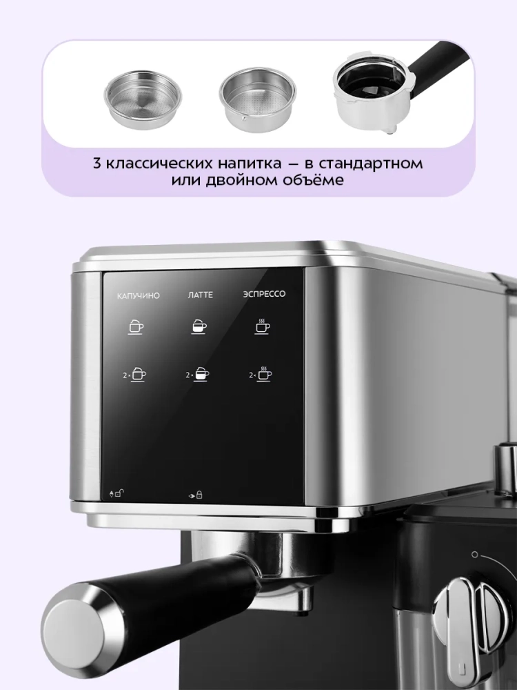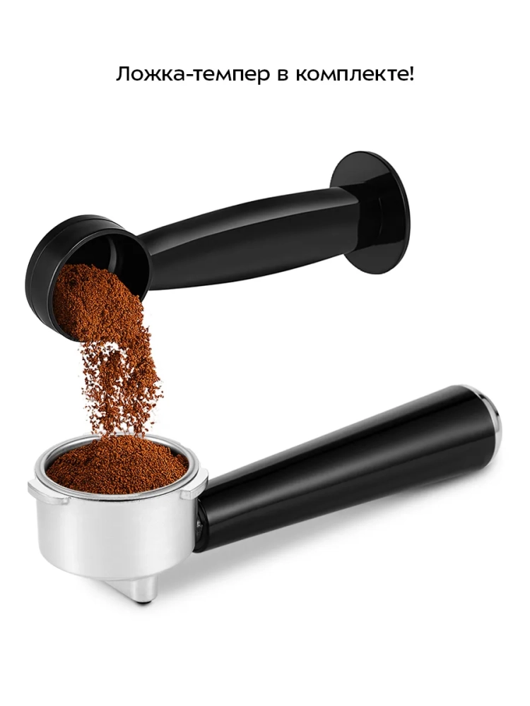 В комплекте предусмотрены 2 металлических фильтра для одинарной и двойной порции эспрессо, металлический рожок и мерная ложка-темпер. Также в комплект входит подставка для маленьких чашек, которую можно выдвинуть из корпуса кофеварки. Сзади корпуса устройства расположены специальные углубления для удобного хранения рожка и фильтра.