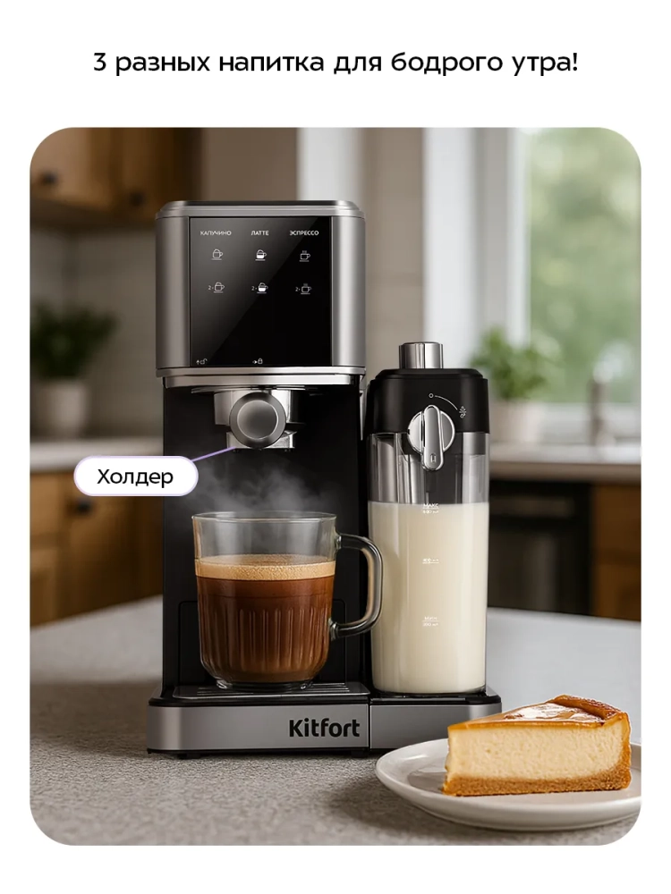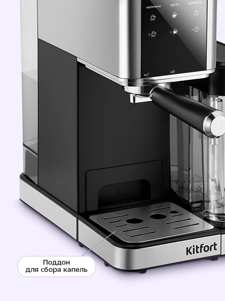 Кофеварка Kitfort КТ-7693 поможет приготовить эспрессо, капучино, латте, а также множество других видов кофе на ваш вкус.