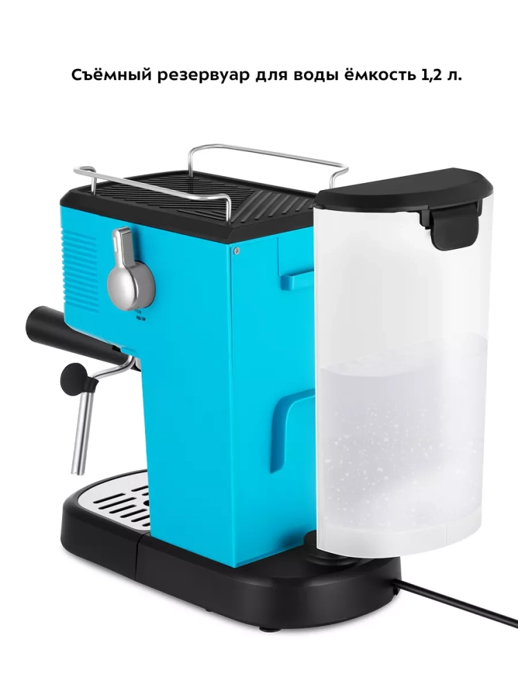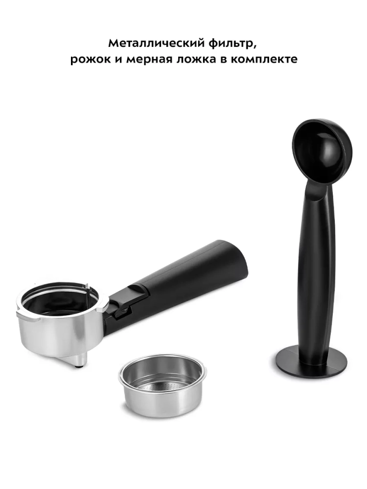 Металлический фильтр с лазерным нанесением отверстий долговечен и не требует использования каких-либо расходующихся частей. Кофеварка оснащена съемным резервуаром для воды и металлическим рожком. Металлический рожок хорошо прогревает напиток, а сам напиток получается насыщенным, густым и с хорошей пенкой. Мерная ложка-темпер поможет наполнить рожок и утрамбовать в нем кофейную таблетку.