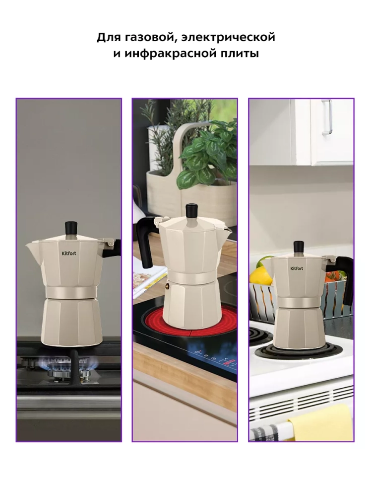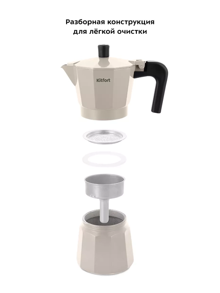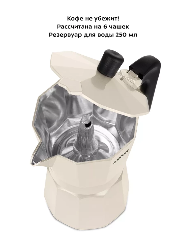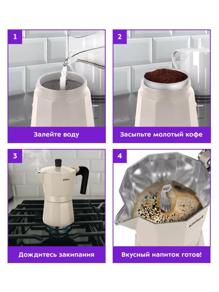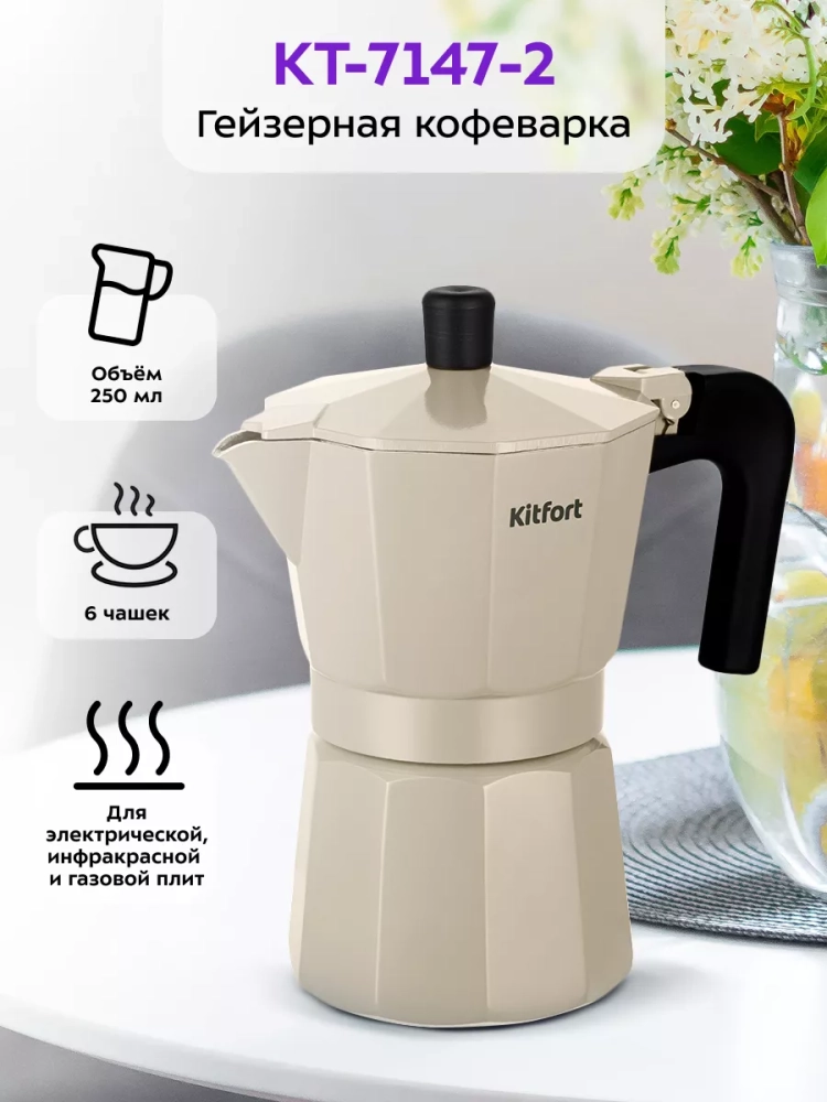 Гейзерная кофеварка Kitfort КТ-7147 поможет приготовить черный кофе. Принцип работы гейзерной кофеварки прост. В резервуар для воды наливают воду, затем на него устанавливают воронку с фильтром, куда добавляют молотый кофе. Сверху накручивается резервуар для кофе. Затем гейзерную кофеварку помещают на плиту. Вода нагревается, пар вытесняет горячую воду из резервуара для воды, вода поднимается по воронке вверх в фильтр с молотым кофе, оттуда готовый кофе поступает в резервуар для кофе. Каждая гейзерная кофеварка рассчитана на приготовление определённого количества чашек кофе. Объем резервуара и фильтра подобраны так, что воронку с фильтром наполняют молотым кофе полностью, а в резервуар для воды наливают столько воды, чтобы уровень воды был чуть ниже парового клапана. Таким образом вы получаете вкусный кофе и нет необходимости отмерять точное количество воды или молотого кофе в граммах. В воронку с фильтром кофеварки Китфорт KT-7147 помещается около 25 грамм кофе, а емкость резервуара для воды — 250 мл. Она рассчитана на приготовление 6 чашек кофе по 40 мл. Преимущество гейзерной кофеварки в простоте приготовления кофе. В сравнении с туркой, при приготовлении кофе в гейзерной кофеварке нет необходимости следить за поднятием пенки, а получаемый кофе не содержит гущи.