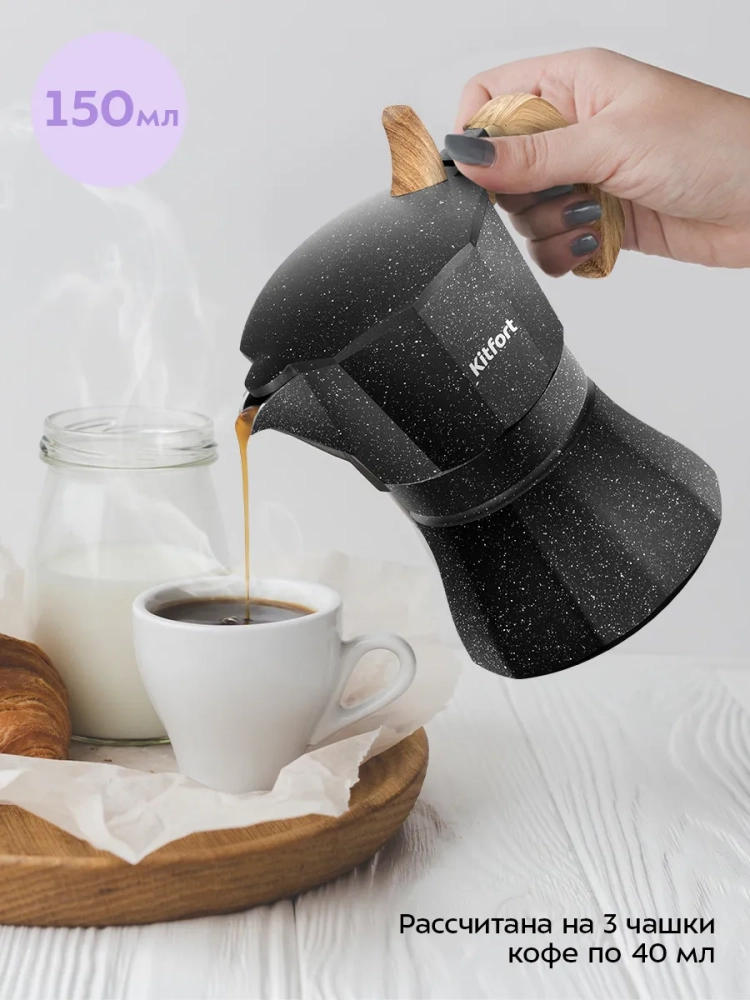 Гейзерная кофеварка Kitfort КТ-7587 поможет приготовить черный кофе.