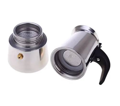 Практичная, надёжная кофеварка из нержавеющей стали прослужит длительное время. Классический дизайн. Ручка и кнопка выполнены из прочного нейлона. Предохранительный клапан давления. Главный принцип гейзерной кофеварки — прохождение кипящей воды не сверху вниз под давлением или действия силы тяжести (как в капельных кофеварках или экспресс-машинах), а снизу верх (закипающая вода поднимается в виде пара). Гейзер состоит из нижней ёмкости для воды специального сита-фильтра для кофе и верхнего чайника для уже готового напитка. Истинным кофеманам отлично подойдет гейзерная кофеварка с минималистичным дизайном, которая впишется в любой интерьер кухни. Гейзерная кофеварка подойдет для компании на 2, 4, 6 или 9 человек.Корпус выполнен из утолщенной стали. Подходит для всех видов плит, кроме индукции. Не подходит для посудомоечной машины.Важно! Необходим кофе среднего помола.