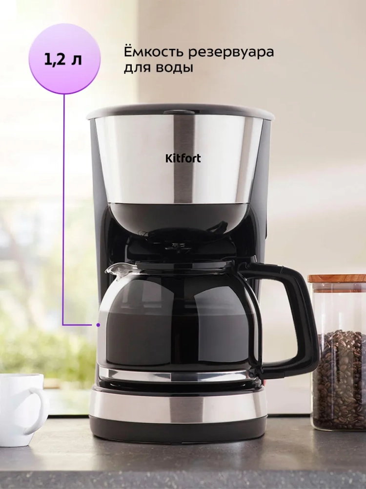 Кофеварка Китфорт оборудована противокапельной системой — затвором, приостанавливающим подачу кофе при вынимании кофейника из кофеварки. Вы можете налить кофе в чашку, не дожидаясь окончания приготовления.