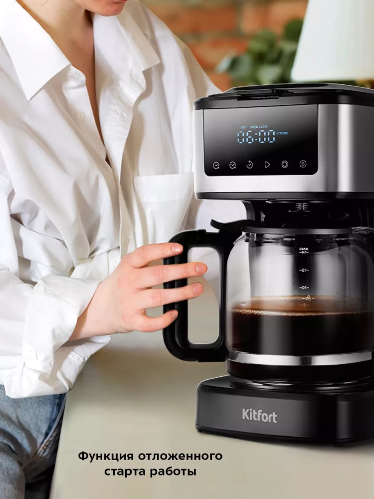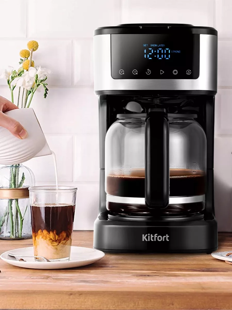 Капельная кофеварка Kitfort КТ-7181 готовит ароматный черный кофе из молотого кофе.
