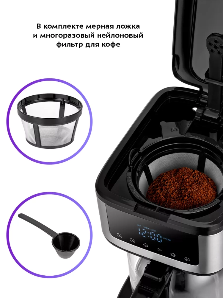 Функция отложенного старта позволит начать приготовление кофе в заданное время. Установите время приготовления, и к моменту, когда вы проснетесь, вас будет ждать ароматный свежезаваренный кофе. Вы также можете выбрать приготовление крепкого кофе или кофе со льдом. Для приготовления кофе со льдом в комплекте предусмотрен защитный коврик, чтобы кофейник не нагревался от тепла, выделяемого платформой для подогрева.