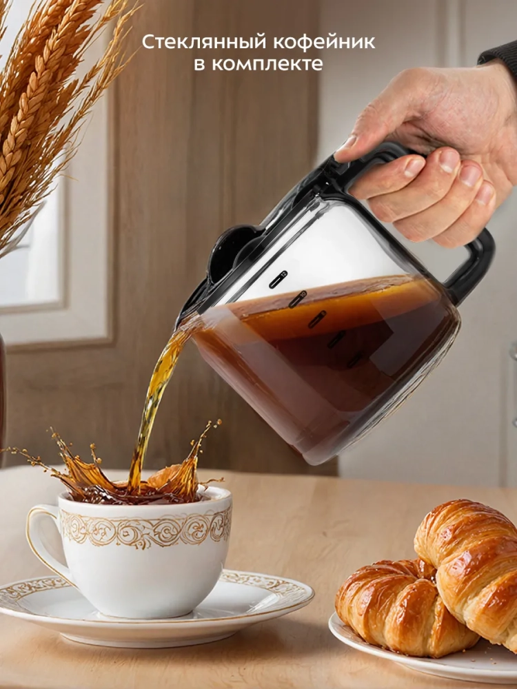 Резервуар для воды емкостью 1,8 л позволяет за один раз приготовить кофе на 12 чашек (по 150 мл). На резервуаре для воды и кофейнике нанесены соответствующие отметки, поэтому вам будет удобно приготовить нужное количество чашек кофе. Кофейник стеклянный, поэтому вы всегда можете видеть, сколько кофе осталось.