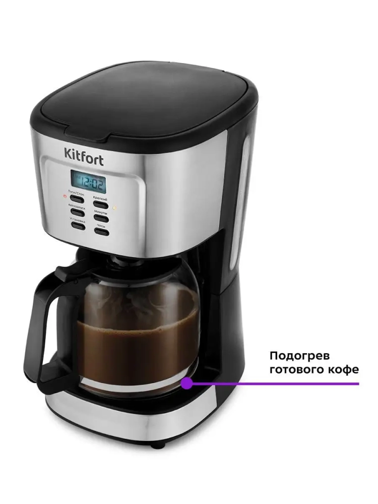 Капельная кофеварка Китфорт КТ-727 поможет приготовить ароматный кофе. В капельной кофеварке вода доводится до температуры 80-90 *С, после чего медленно поступает в фильтр с молотым кофе. Пройдя через него, она попадает в кофейник. По окончании приготовления кофеварка перейдет в режим подогрева. Платформа с подогревом, на которой стоит кофейник с готовым кофе, будет горячей в течение 40 минут, затем кофеварка выключится. Кофеварка оборудована противокапельной системой - затвором, приостанавливающим подачу кофе при вынимании кофейника из кофеварки. Вы можете налить кофе в чашку, не дожидаясь окончания приготовления. Резервуар емкостью 1,6 л позволяет за один раз приготовить кофе на 12 чашек емкостью 130 мл. Корпус кофейника прозрачный, поэтому вы всегда можете видеть, сколько кофе еще осталось. На задней части корпуса предусмотрен отсек для хранения шнура. Кофеварка предназначена для приготовления кофе в домашних условиях или в офисе.