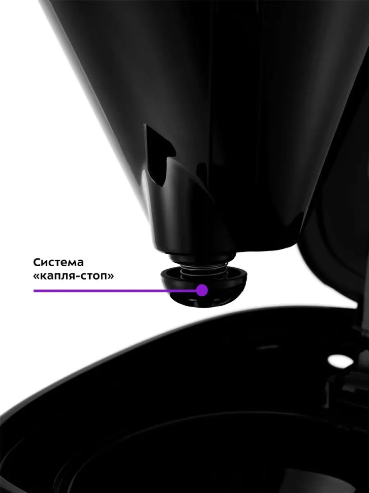 Кофеварка оборудована противокапельной системой — затвором, приостанавливающим подачу кофе при вынимании кофейника из кофеварки. Вы можете налить кофе в чашку, не дожидаясь окончания приготовления.