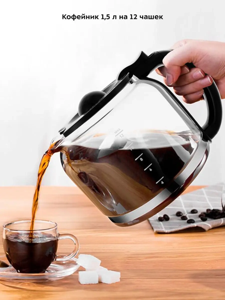Резервуар емкостью 1,6 л позволяет за один раз приготовить кофе на 12 чашек емкостью 130 мл. Корпус кофейника прозрачный, поэтому вы всегда можете видеть, сколько кофе еще осталось. На задней части корпуса предусмотрен отсек для хранения шнура.