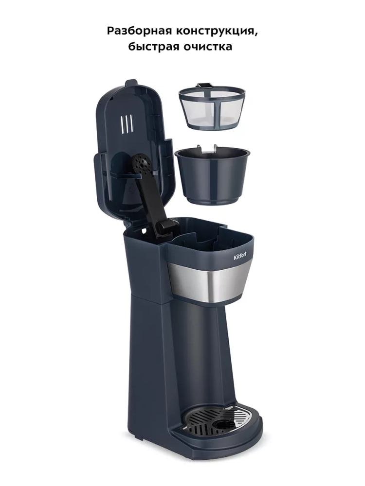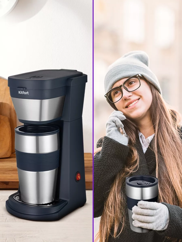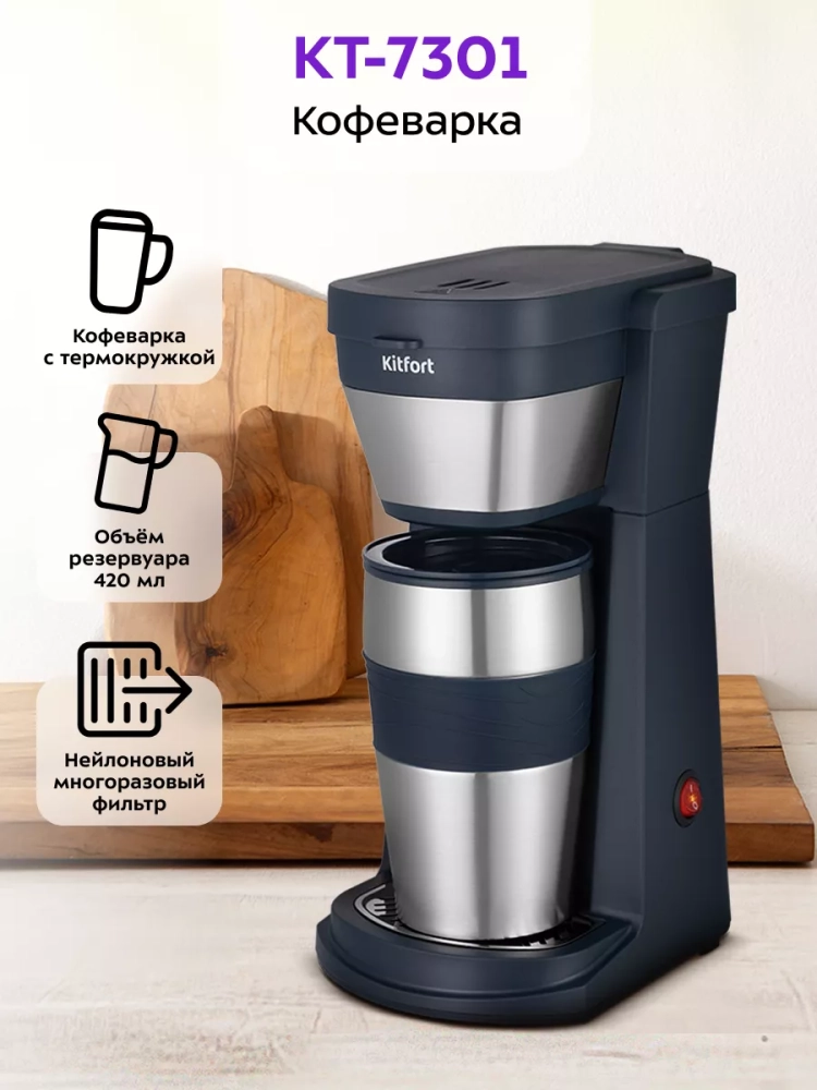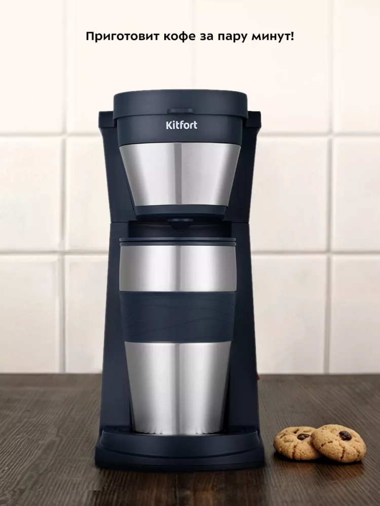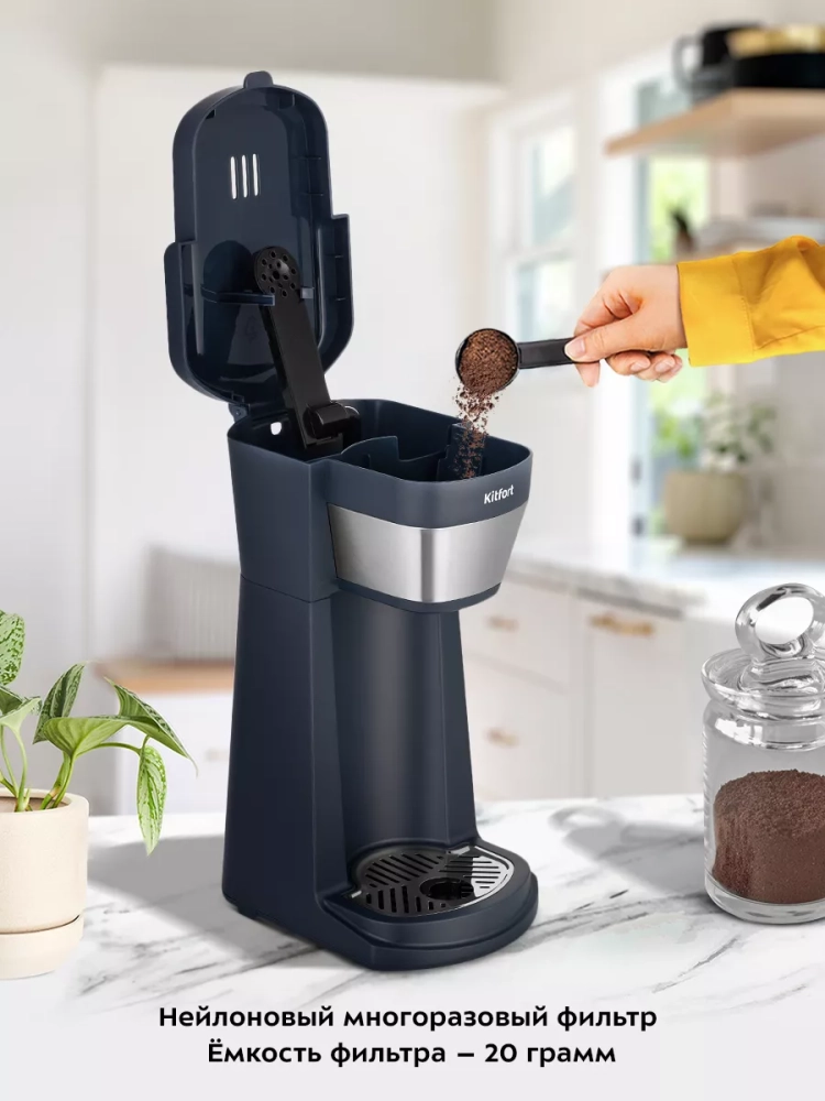 Капельная кофеварка Kitfort КТ-7301 готовит ароматный черный кофе из молотого кофе одним нажатием кнопки.