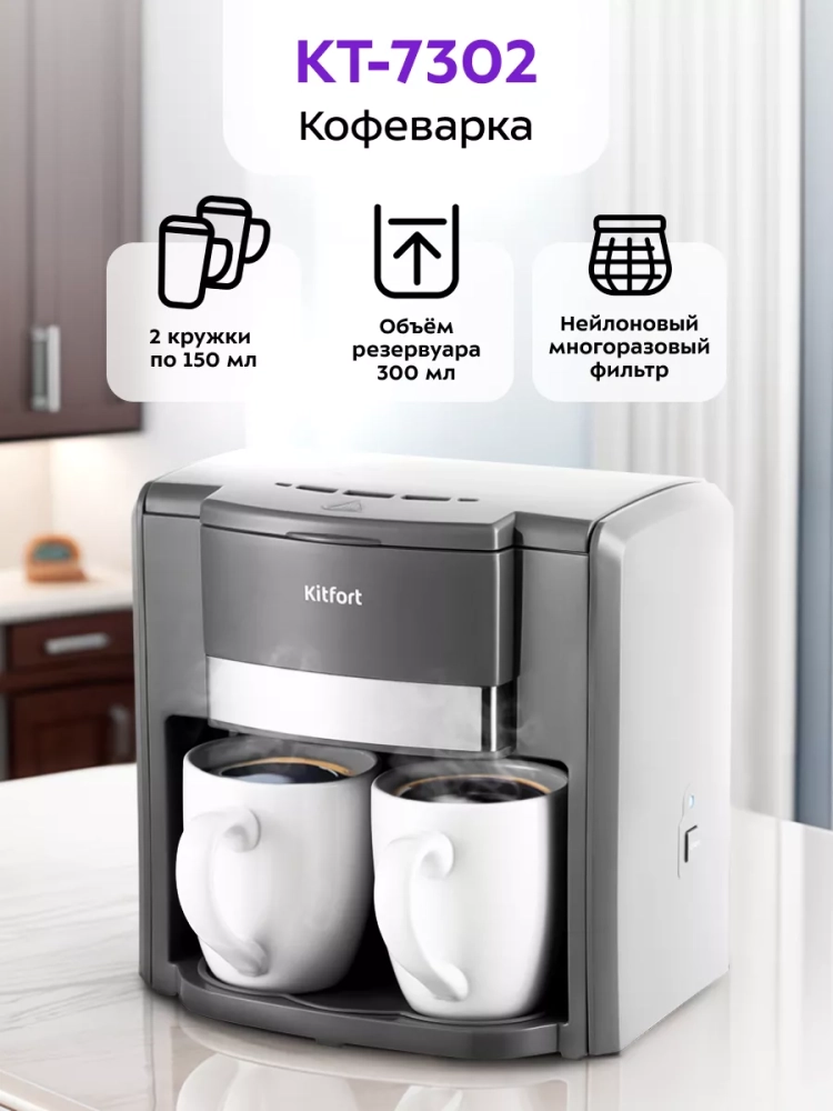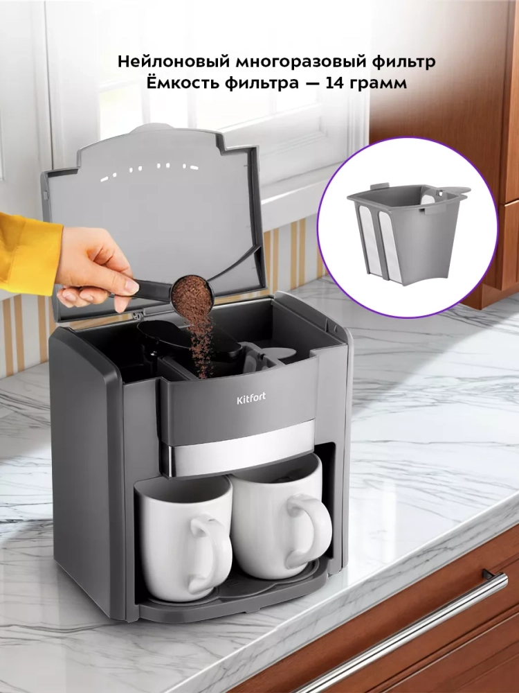 Капельная кофеварка Kitfort КТ-7302 готовит ароматный черный кофе из молотого кофе одним нажатием кнопки.