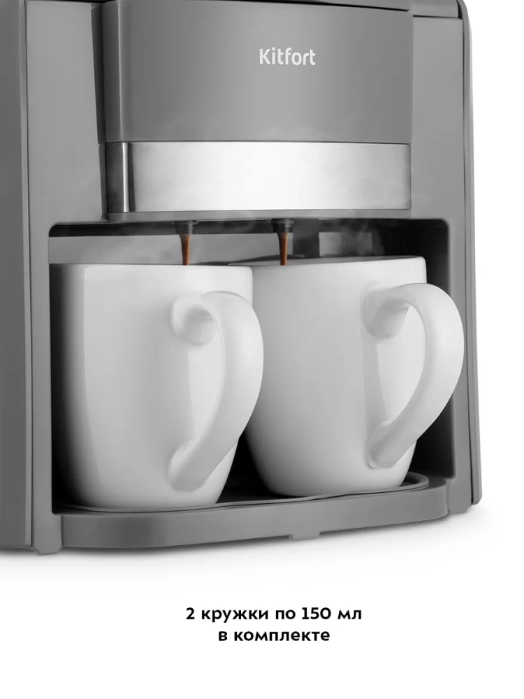 В капельной кофеварке горячая вода медленно поступает в фильтр с молотым кофе. Пройдя через него, она попадает в кружки. Две керамические кружки идут в комплекте.