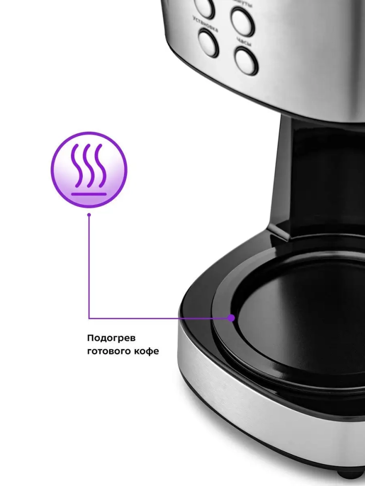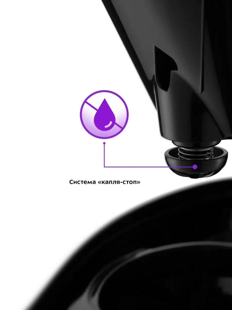 Кофеварка оборудована противокапельной системой — затвором, приостанавливающим подачу кофе при вынимании кофейника из кофеварки. Вы можете налить кофе в чашку, не дожидаясь окончания приготовления.