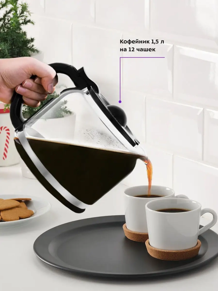 Резервуар емкостью 1,6 л позволяет за один раз приготовить кофе на 12 чашек емкостью 130 мл. Корпус кофейника прозрачный, поэтому вы всегда можете видеть, сколько кофе еще осталось. На задней части корпуса предусмотрен отсек для хранения шнура.