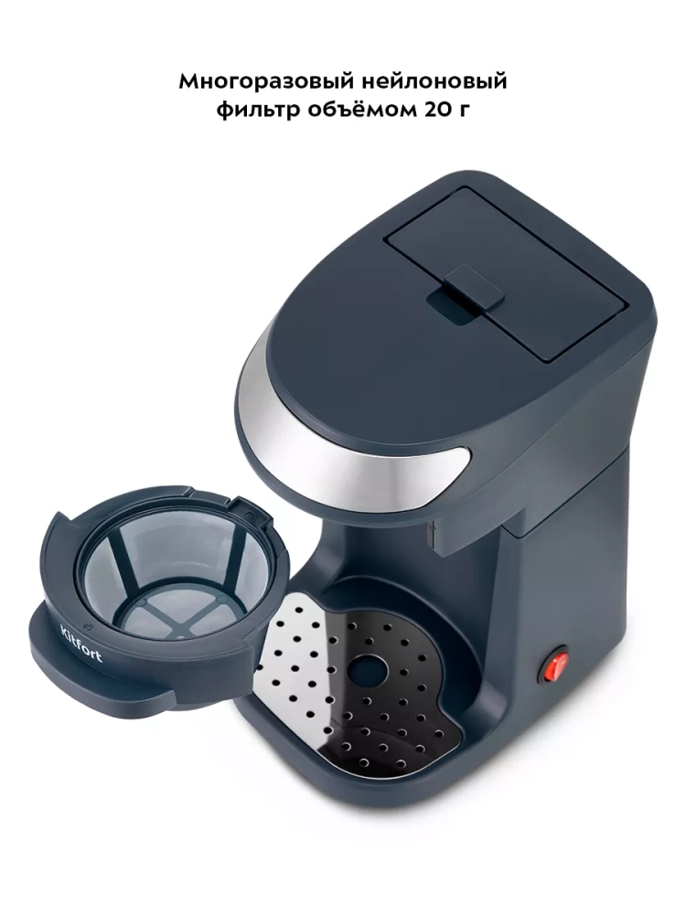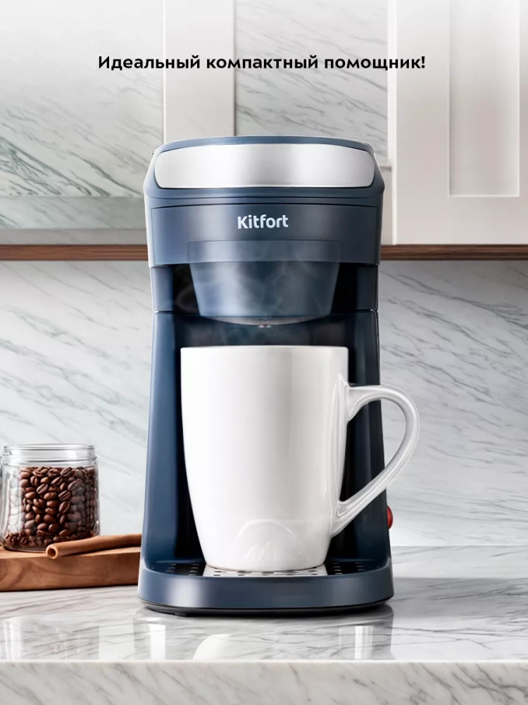 Капельная кофеварка Kitfort КТ-7312 готовит ароматный черный кофе из молотого кофе одним нажатием кнопки.