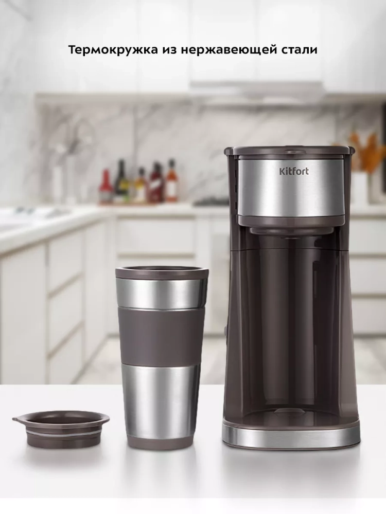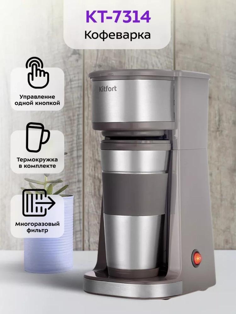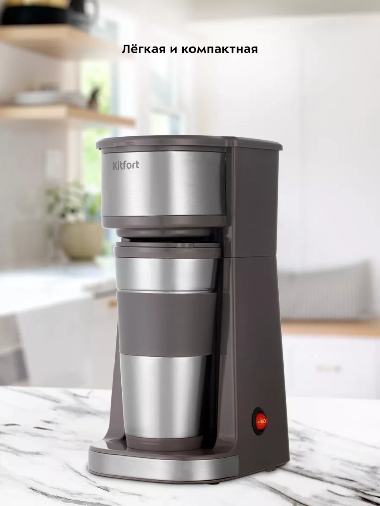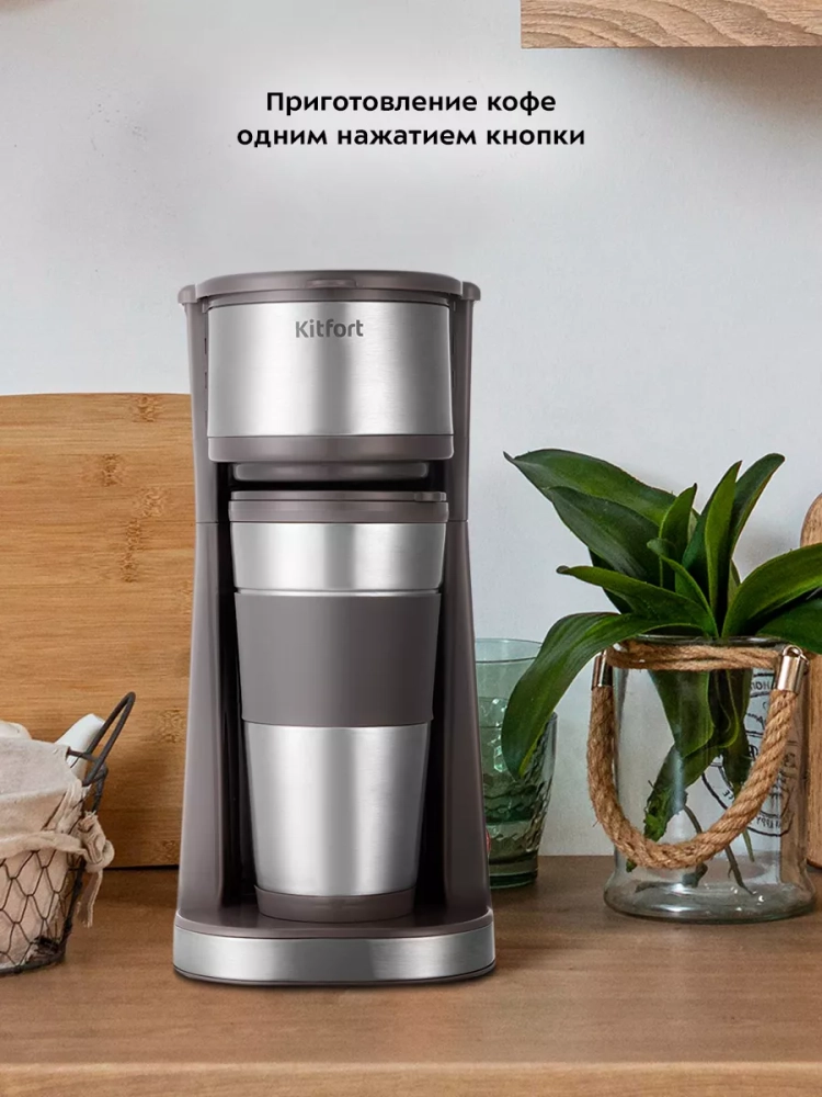 Капельная кофеварка Kitfort КТ-7314 готовит ароматный черный кофе из молотого кофе одним нажатием кнопки.