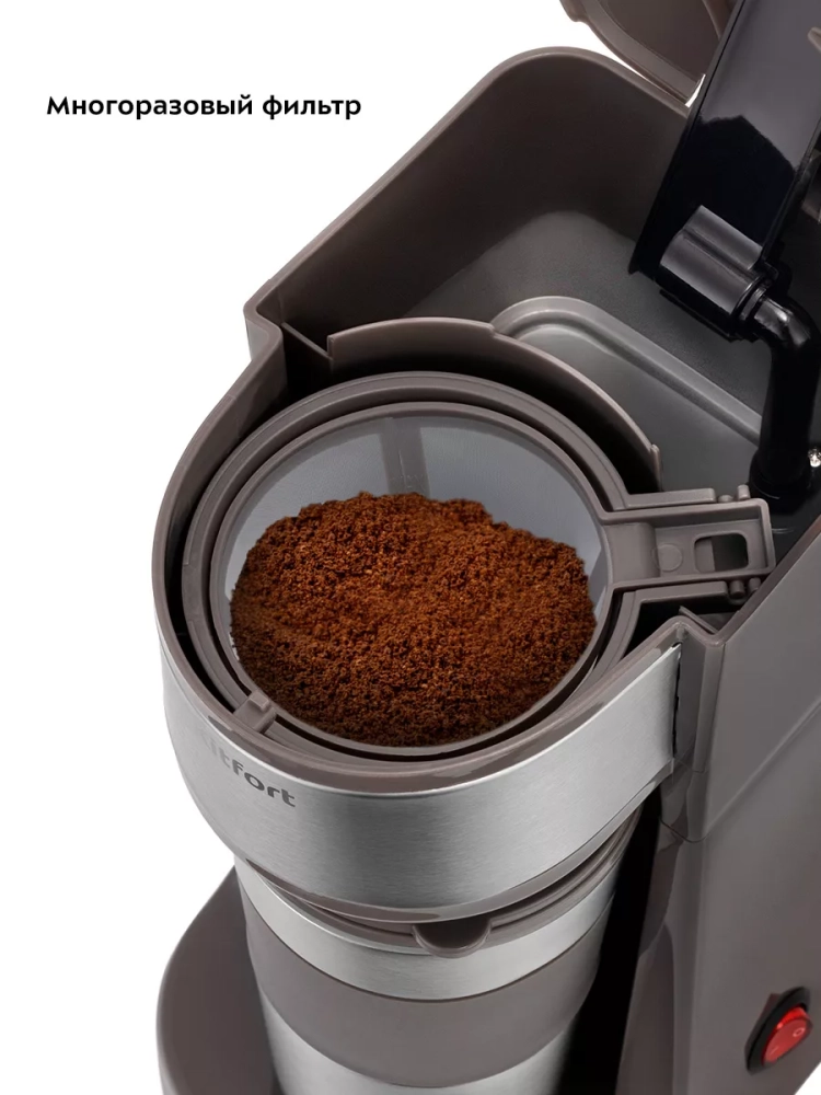 В кофеварке горячая вода медленно поступает в фильтр с молотым кофе. Пройдя через него, вода попадает в термокружку, которая сохранит тепло вашего кофе. Термокружка выполнена из нержавеющей стали с силиконовой вставкой, которая не дает вам обжечься или выронить из рук термокружку. Крышка термокружки позволяет пить кофе на ходу, благодаря удобной форме отверстия для питья, которое можно закрывать, например, при ходьбе.