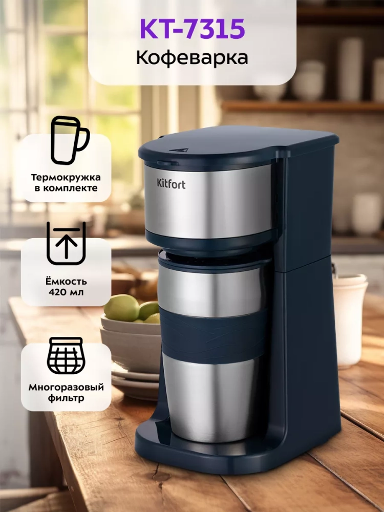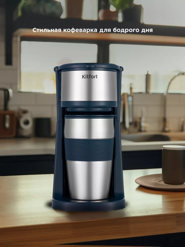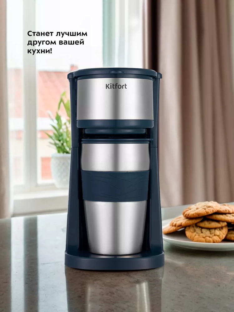 Капельная кофеварка Kitfort КТ-7315 готовит ароматный черный кофе из молотого кофе одним нажатием кнопки.