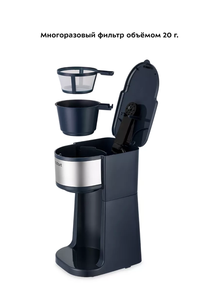 Многоразовым фильтром можно пользоваться неограниченное количество раз. Сетка фильтра изготовлена из нейлона. Фильтр вмещает 20 грамм молотого кофе, а резервуар для воды имеет емкость 450 мл.