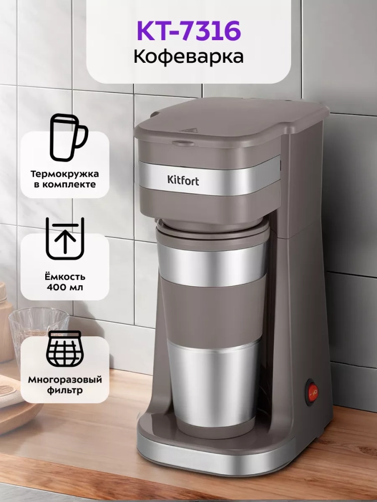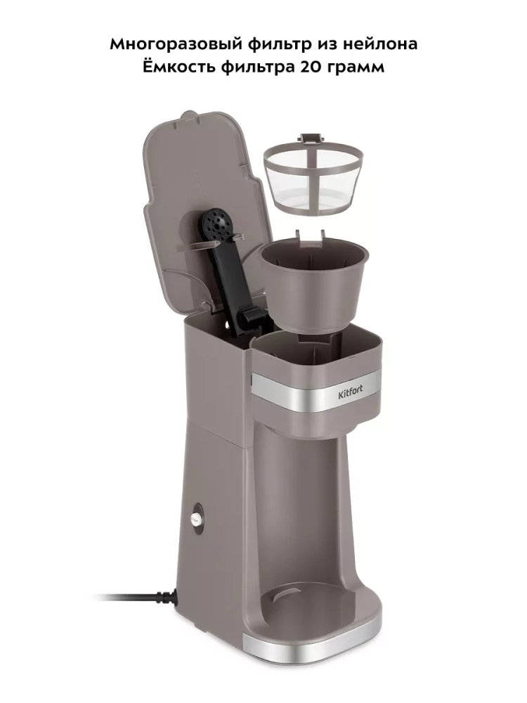 Капельная кофеварка Kitfort КТ-7316 готовит ароматный черный кофе из молотого кофе одним нажатием кнопки.