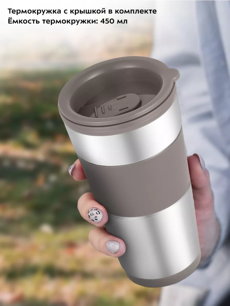 В кофеварке горячая вода медленно поступает в фильтр с молотым кофе. Пройдя через него, вода попадает в термокружку, которая сохранит тепло вашего кофе. Термокружка выполнена из нержавеющей стали с силиконовой вставкой, которая не дает вам обжечься или выронить из рук термокружку. Крышка термокружки позволяет пить кофе на ходу, благодаря удобной форме отверстия для питья, которое можно закрывать, например, при ходьбе.