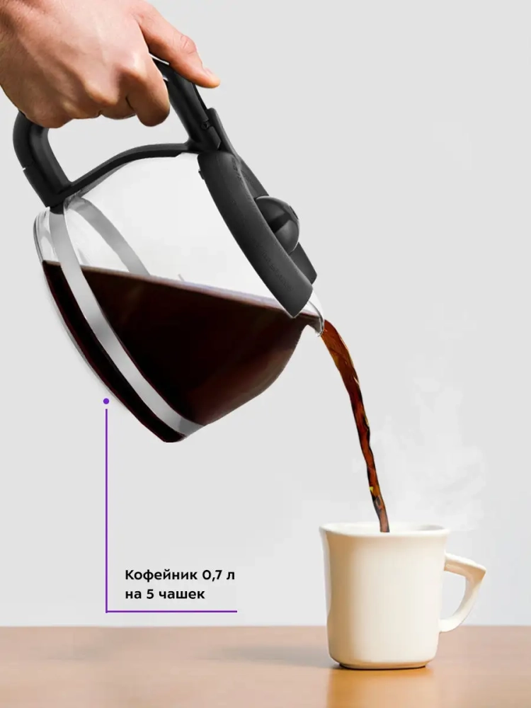 Резервуар емкостью 700 мл позволяет за один раз приготовить кофе на 5 чашек емкостью 140 мл. Корпус кофейника прозрачный, поэтому вы всегда можете видеть, сколько кофе еще осталось. На задней части корпуса предусмотрен отсек для хранения шнура.
