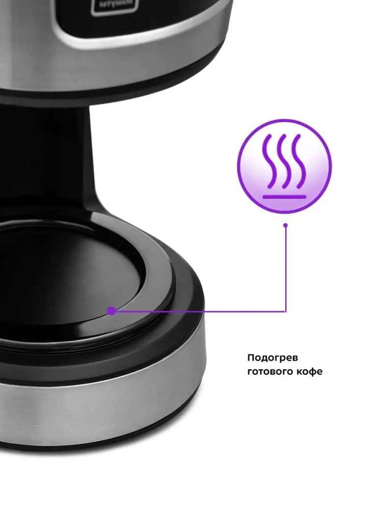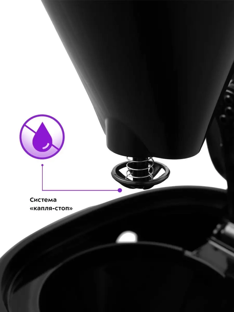 Кофеварка оборудована противокапельной системой — затвором, приостанавливающим подачу кофе при вынимании кофейника из кофеварки. Вы можете налить кофе в чашку, не дожидаясь окончания приготовления.
