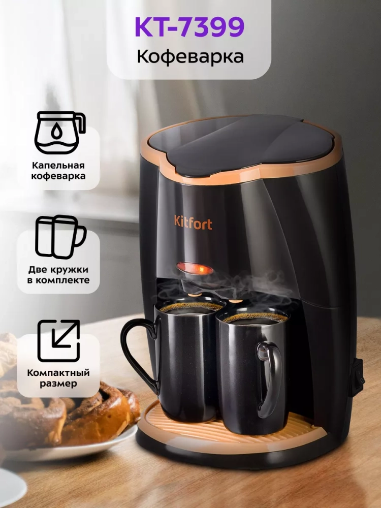 Капельная кофеварка Kitfort КТ-7399 готовит ароматный черный кофе из молотого кофе. Кофеварка отличается компактностью и поместится на любой кухне. Она позволяет легко и быстро приготовить кофе на две кружки одновременно.