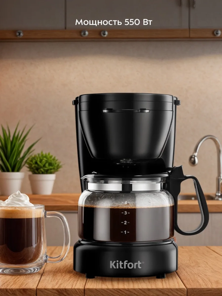 Капельная кофеварка Kitfort КТ-7487 готовит ароматный черный кофе из молотых кофейных зерен.