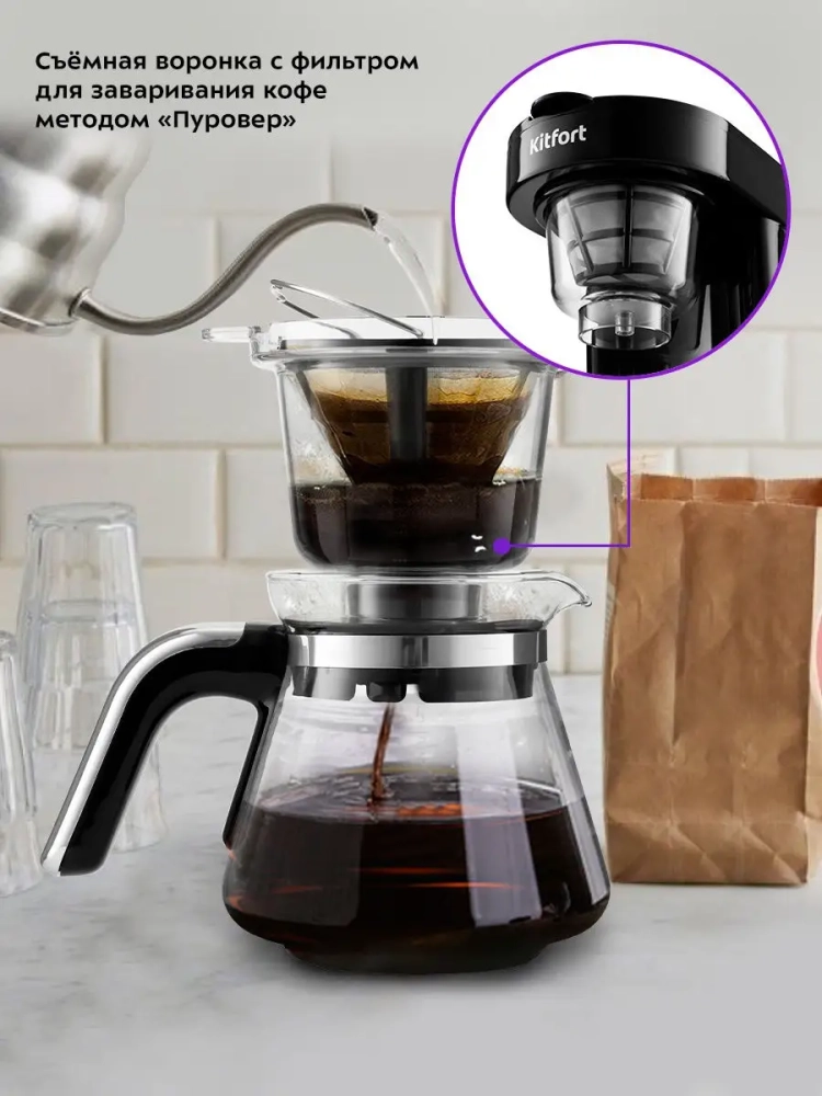 Эта кухонная техника станет отличным дополнением для любой кухни, будь то дома или в офисе. Компактные размеры позволяют разместить кофеварку даже на небольшой кухне, не занимая много места. Кофемашина Kitfort КТ-759 идеально подходит для пуровера, обеспечивая насыщенный вкус и аромат вашего любимого напитка.
