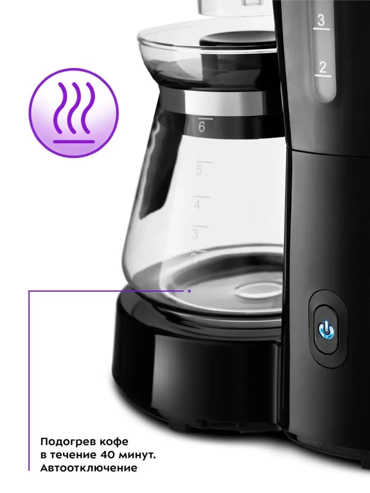 Кофеварка оснащена функцией подогрева, которая поддерживает температуру готового напитка, чтобы вы могли наслаждаться горячим кофе в любое время. Автоотключение обеспечивает безопасность и экономию электроэнергии, автоматически отключая аппарат после завершения цикла варки.