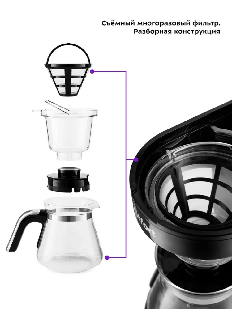Электрическая кофеварка Kitfort отличается простотой использования и надежностью. Капельная система обеспечивает равномерное распределение воды через фильтр, что способствует оптимальной экстракции вкуса и аромата. Встроенный фильтр многоразового использования позволяет избежать необходимости постоянной замены, что делает эту технику более экономичной и экологичной.