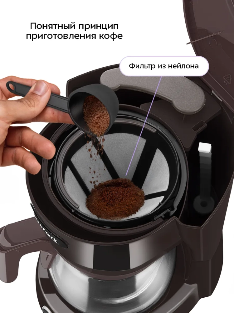 При приготовлении кофе вода нагревается, а затем подается в фильтр с молотым кофе. Многоразовым фильтром можно пользоваться неограниченное количество раз. Пройдя через фильтр, кофе поступает в стеклянный кофейник. В месте установки кофейника находится платформа для подогрева. При включении кофеварки включается нагревательный элемент, расположенный под платформой. Он нагревает воду, поступающую из резервуара, и платформу для подогрева. По завершении приготовления кофе платформа продолжит нагреваться. Выключите кофеварку через 30–40 минут.