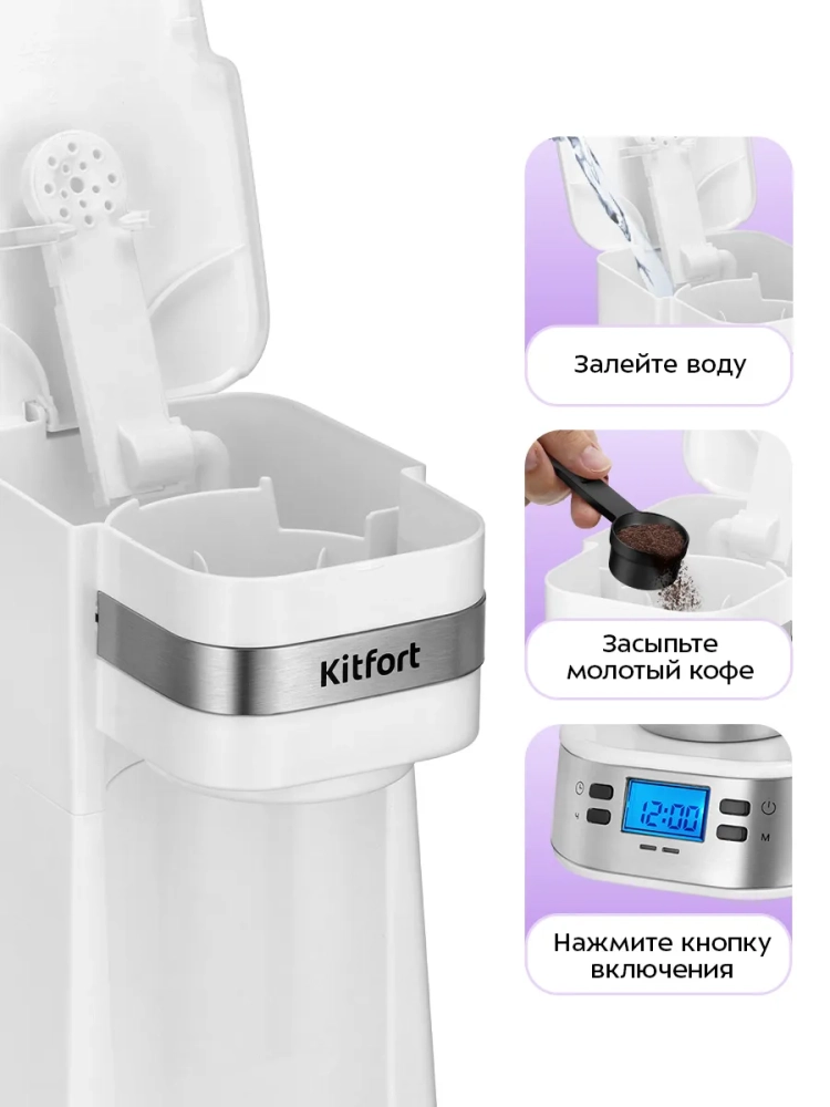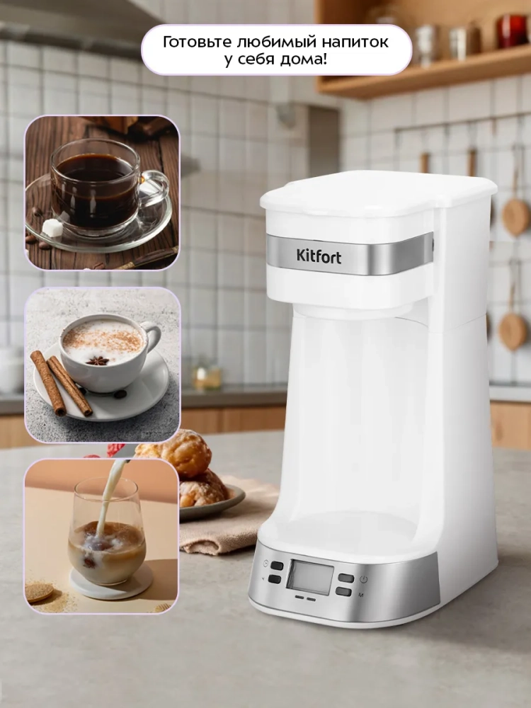 Капельная кофеварка Kitfort КТ-7625 готовит ароматный черный кофе из молотого кофе одним нажатием кнопки.