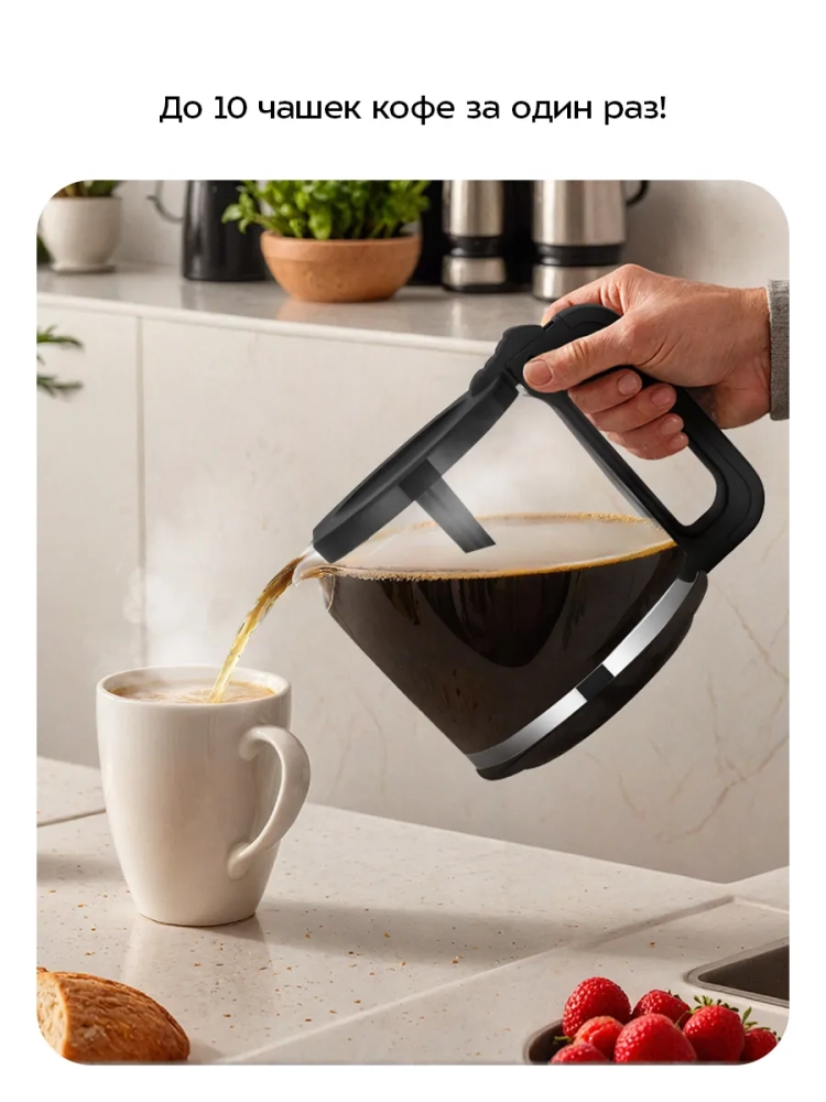 Резервуар для воды емкостью 1,25 л позволяет за один раз приготовить кофе на 10 чашек (по 125 мл). Внутри резервуара для воды и на кофейнике нанесены соответствующие отметки, поэтому вам будет удобно приготовить нужное количество чашек кофе. Кофейник стеклянный, поэтому вы всегда можете видеть, сколько кофе осталось.
