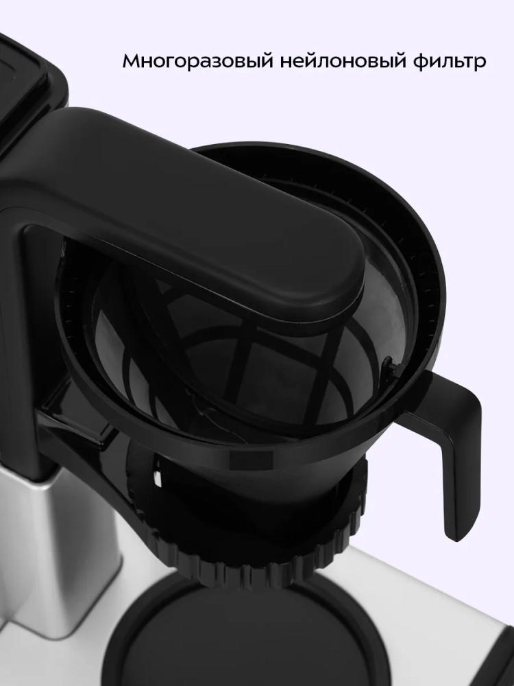При приготовлении кофе вода нагревается, а затем подается в фильтр с молотым кофе. Многоразовым фильтром можно пользоваться неограниченное количество раз. Пройдя через фильтр, кофе поступает в стеклянный кофейник. В месте установки кофейника находится платформа для подогрева, которая позволит сохранить готовый напиток теплым на 30 минут, по истечении 30 минут подогрева устройство выключится.