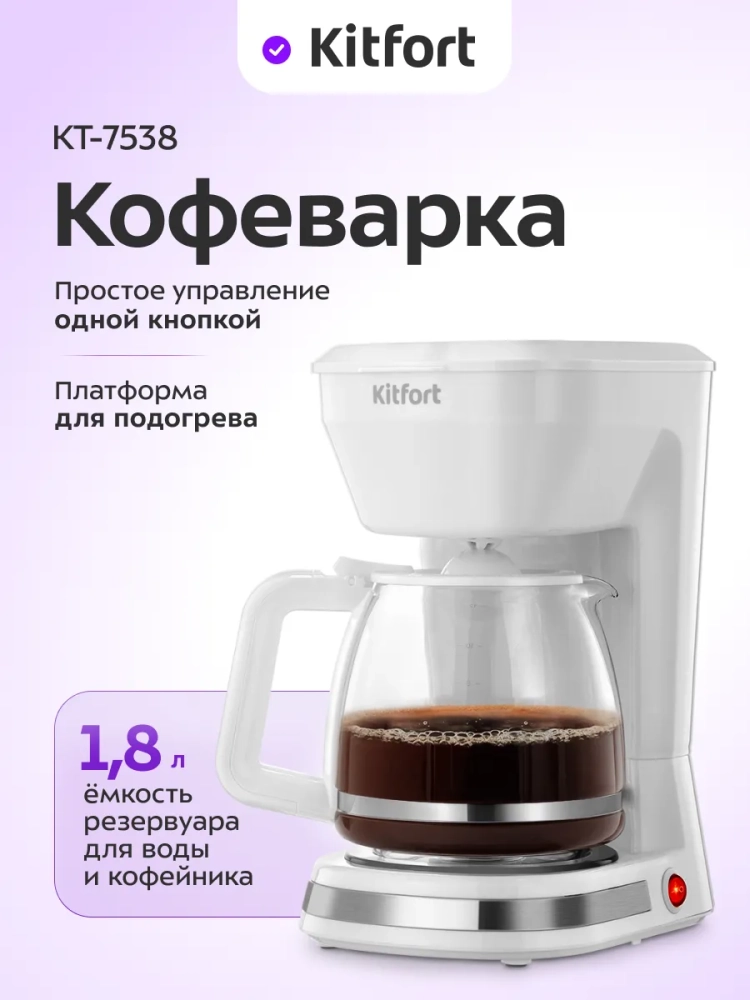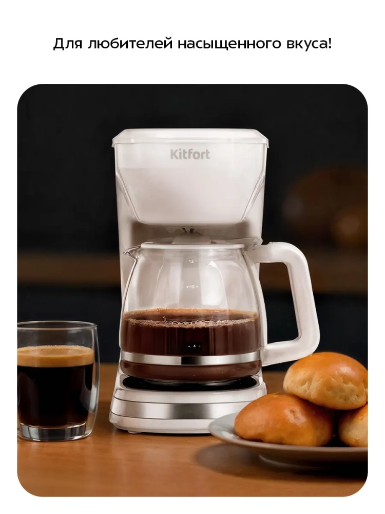 Капельная кофеварка Kitfort КТ-7538 готовит ароматный черный кофе из молотого кофе.
